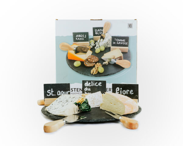 Maak indruk met onze Kaasplank op Leisteen een stijlvolle plank met drie heerlijke, buitenlandse zachte kaasjes. Compleet met bijpassende mesjes en krijtbordjes om de kazen te labelen. De leisteen plank is niet alleen een eyecatcher op tafel, maar ook eenvoudig schoon te maken. Perfect voor een gezellige borrel of een luxe kaasavond thuis!