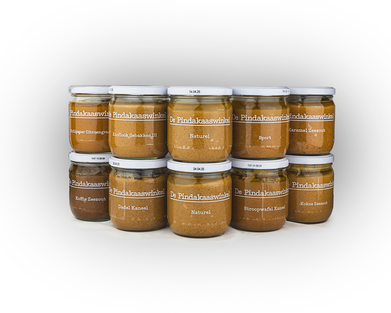 Welke smaak? | Naturel Pindakaas, Naturel met Pindastukjes , Stroopwafel Kaneel, Witte Chocola met Pindastukjes, Sport, Pizza, Kokos Zeezout, Karamel Zeezout, Knoflook Gebakken Ui, Chilipeper Citroengras, Dadel Kaneel, Koffie Zeezout |